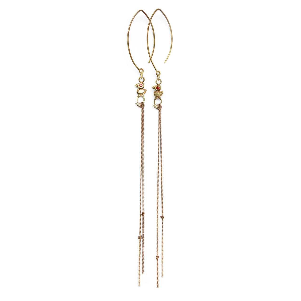 Earrings are with long 2 in 1 chains, it means that the earrings can be worn with the chains or without. Earrings have 2 chains both with the length of 25 cm. They are connected with the earrings with a loose knot, that is easy to take away or to put back.